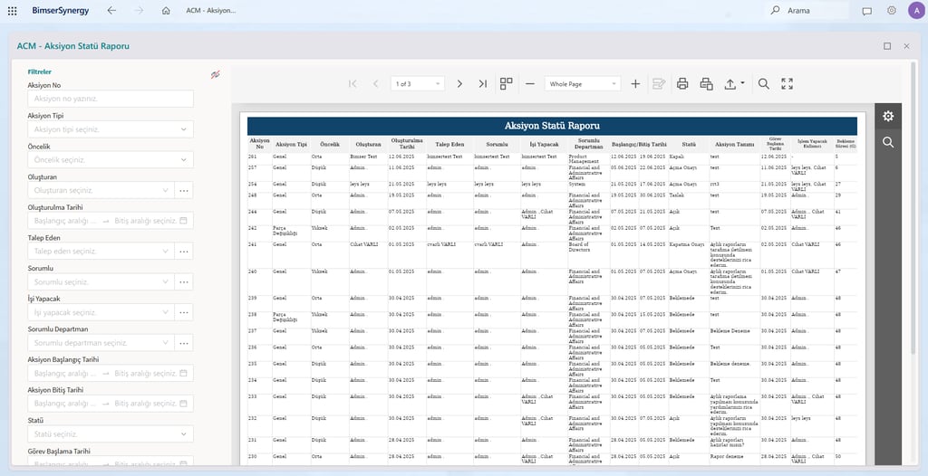 Tüm aksiyonları detaylı biçimde raporlayabilir, ihtiyaçlarınıza uygun formatlarda çıktı alarak veriye kolayca erişebilirsiniz.