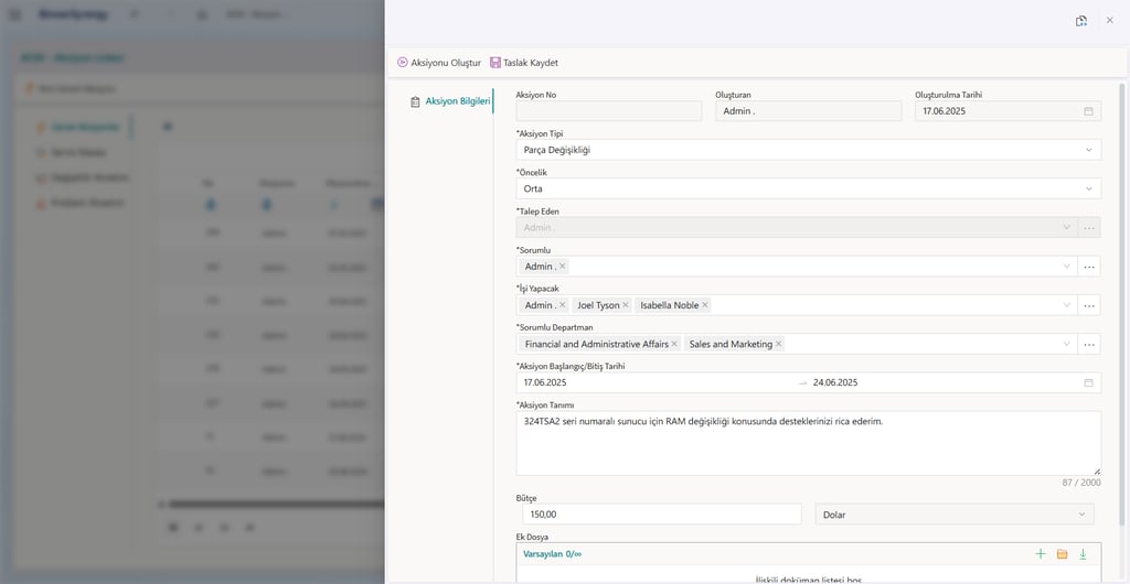 İyileştirme gerektiren durumlar için görevler oluşturabilir, sorumlular atayarak takip süreçlerini netleştirebilirsiniz.