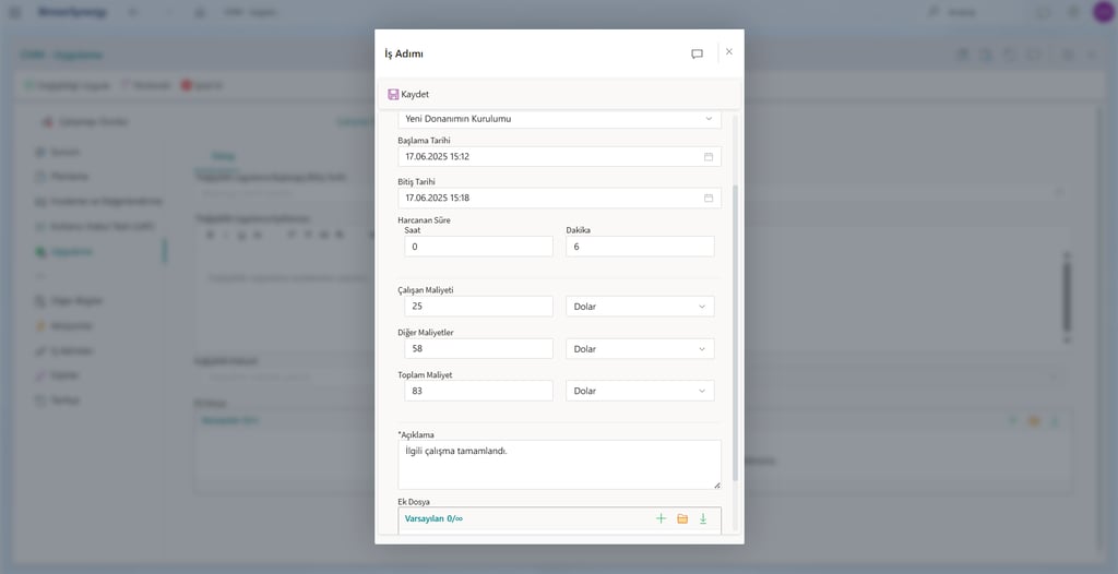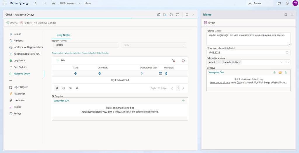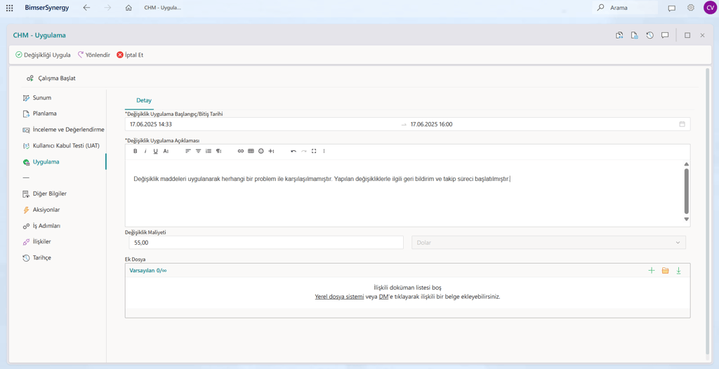 Kullanıcı Kabul Testi (UAT), Uygulama, Geri Bildirim aşamalarında İş Adımı tanımlayarak hangi kullanıcının değişiklik üzerinde ne kadar süreyle çalıştığını ve bu çalışmanın maliyetini detaylı bir şekilde kayıt altına alarak raporlayabilirsiniz.