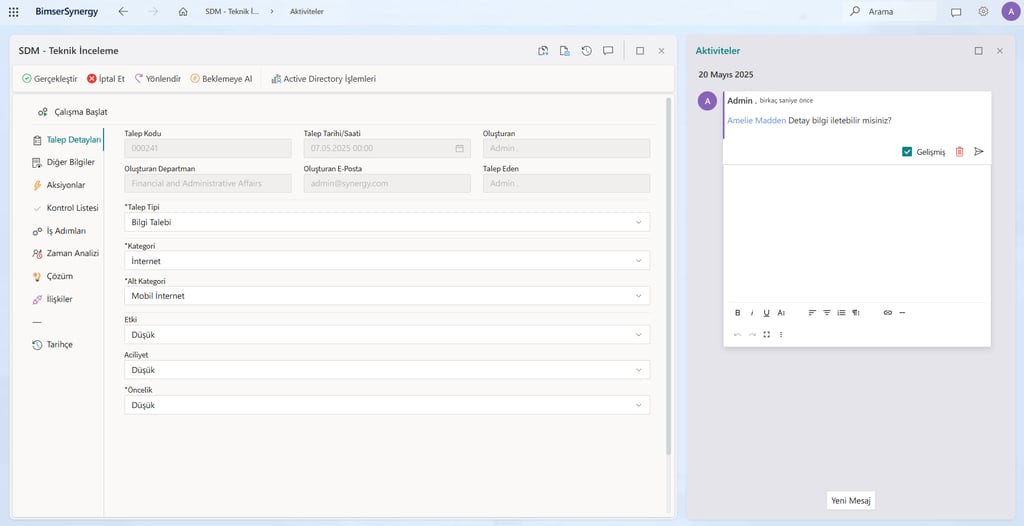 Açılan servis talepleri için kullanıcılar ile Aktiviteler üzerinden iletişime geçilerek mesaj yazılabilir. Aktiviteler üzerinden yazılan mesajlar ilgili kullanıcıya sistem tarafından ayrıca mail olarak gönderilir. Böylece aktiviteler aracılığıyla son kullanıcılarla kolay bir şekilde iletişim kurulabilir.
