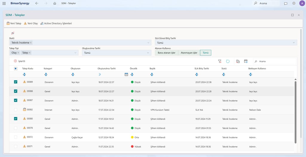 Atanmış taleplerin kolayca filtrelenebilmesi ve önceliklendirilmesi sayesinde öncelik, statü ve SLA süresi gibi kriterlerle taleplerinizi listeleyebilir, teknik ekiplerinizin iş yükünü verimli şekilde yönetebilirsiniz.